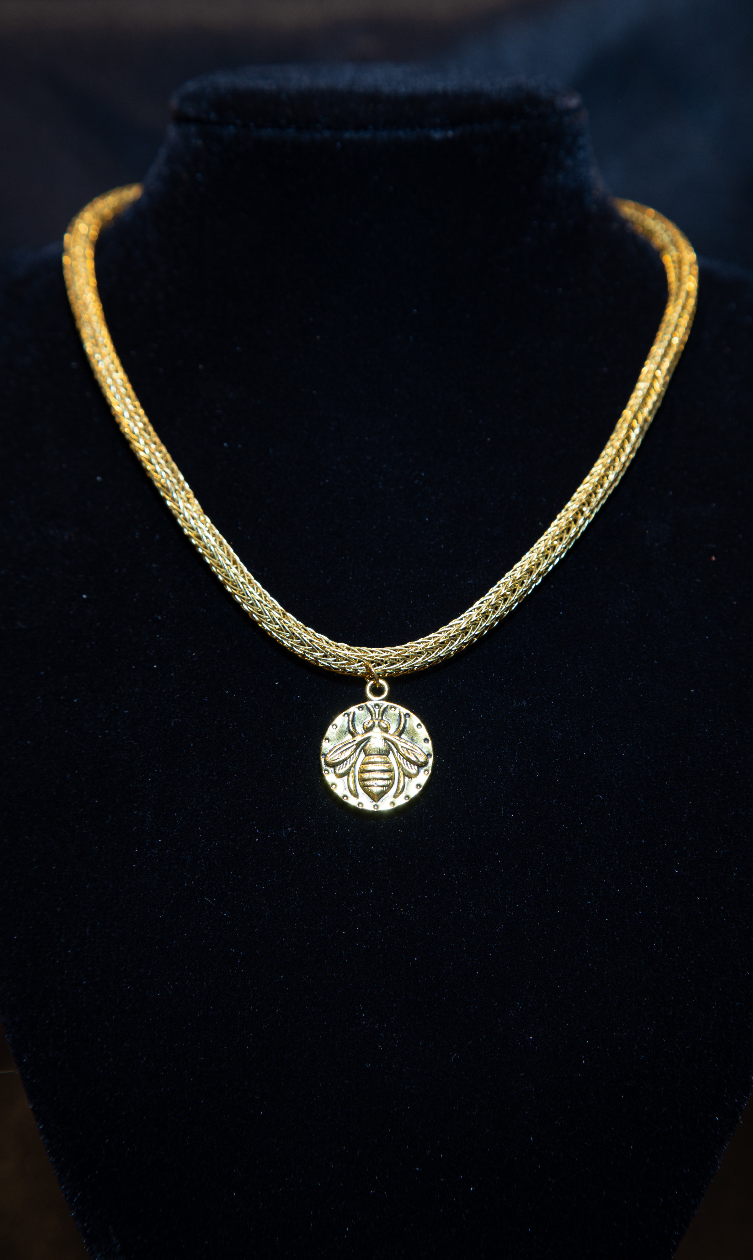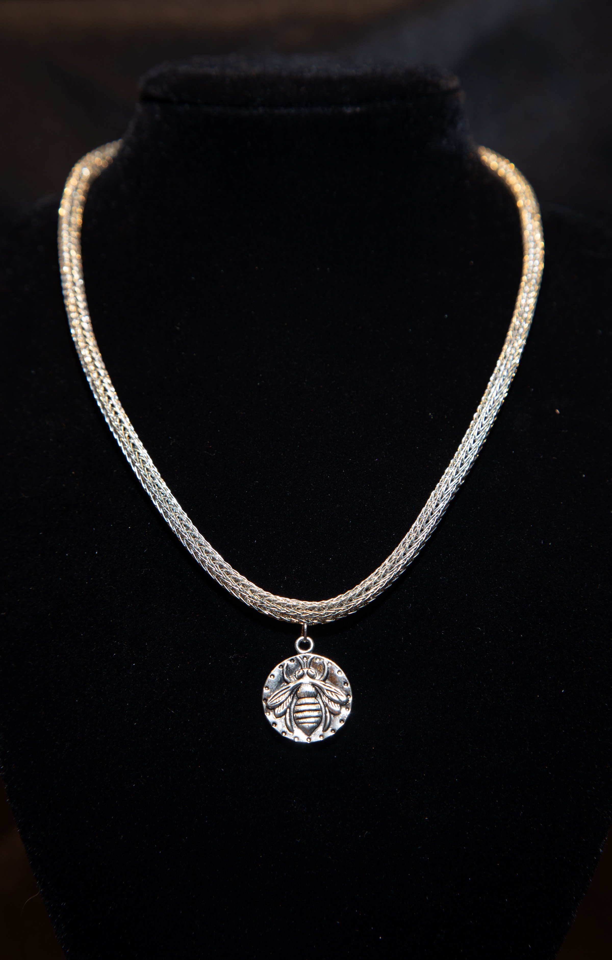 The handmade viking knit chain is made of silver, gold, or bronze plated pure copper wire. The end cap wire is made of plated copper wire, except for the gold which is made of brass. The bee medallions are made of alloy and the lobster claws and jump rings are made of iron alloy.