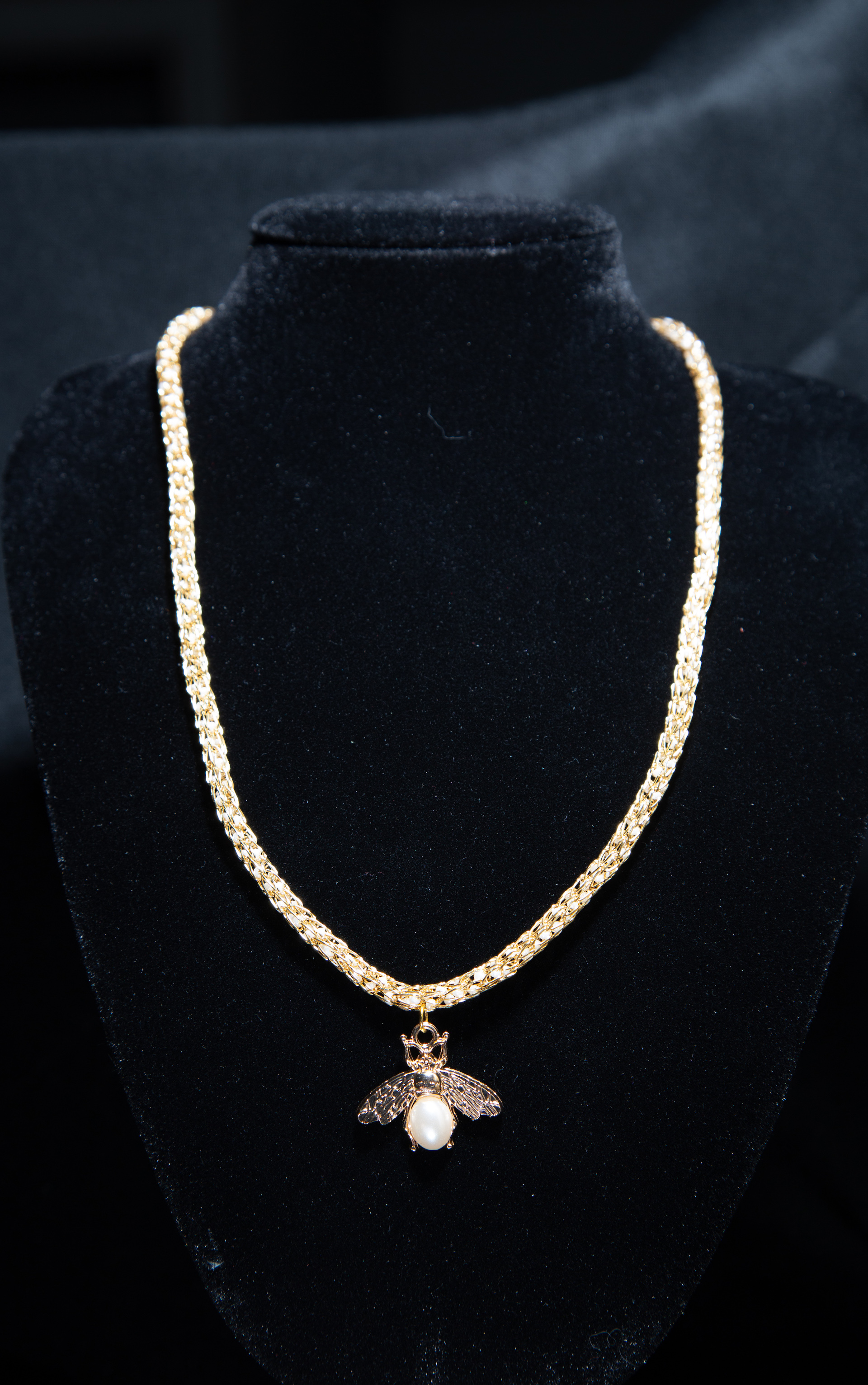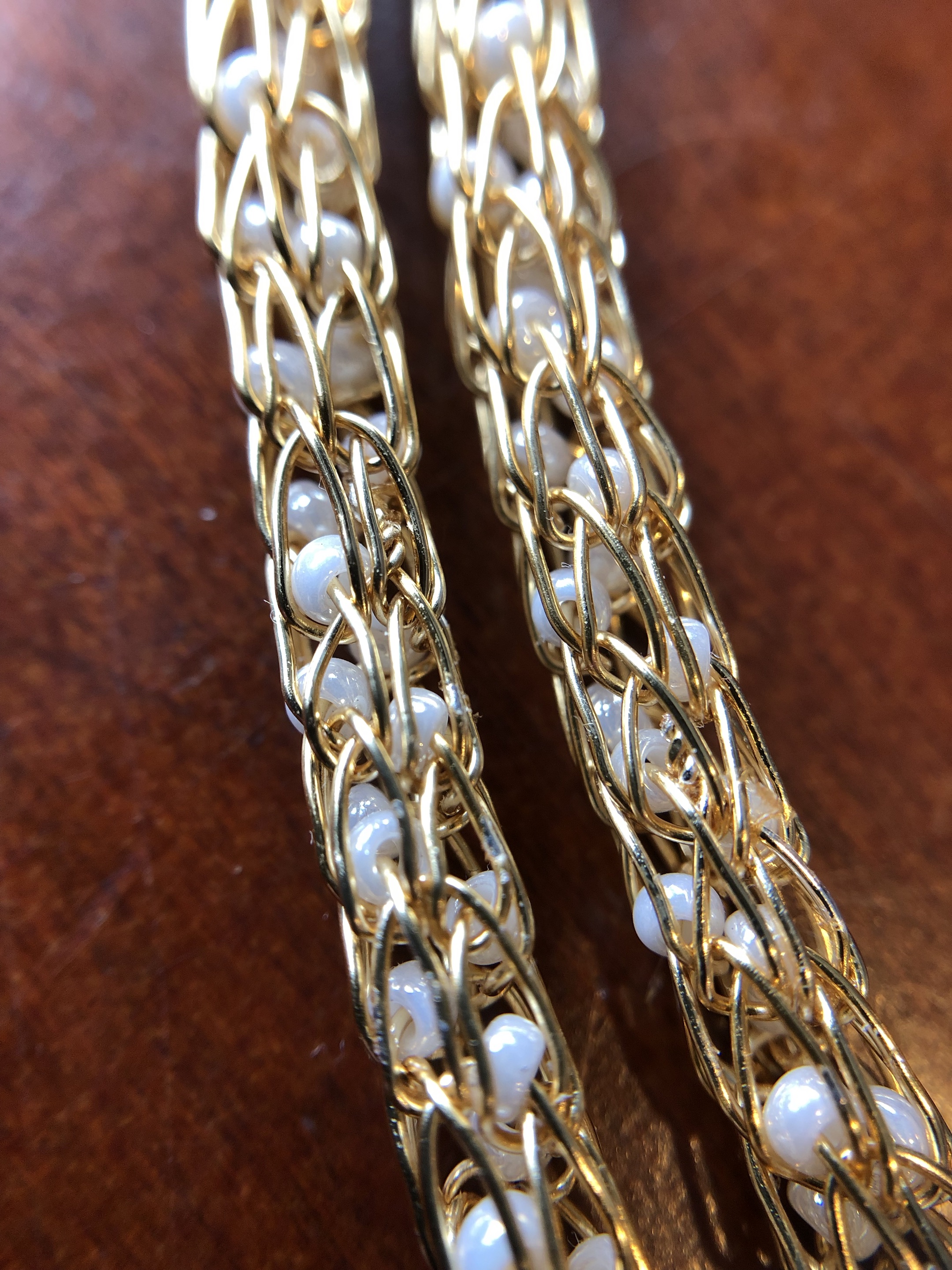 The necklaces are approximately 21 ½ - 22 inches (54.7 - 55.9 centimeters) in length, including the lobster claw clasp. The handmade viking knit chain is made of gold plated copper wire with glass beads woven in. The bee charm is gold plated with faux pearl. The lobster claw clasp and jump rings are made of iron alloy. The end cap wire is made of brass.