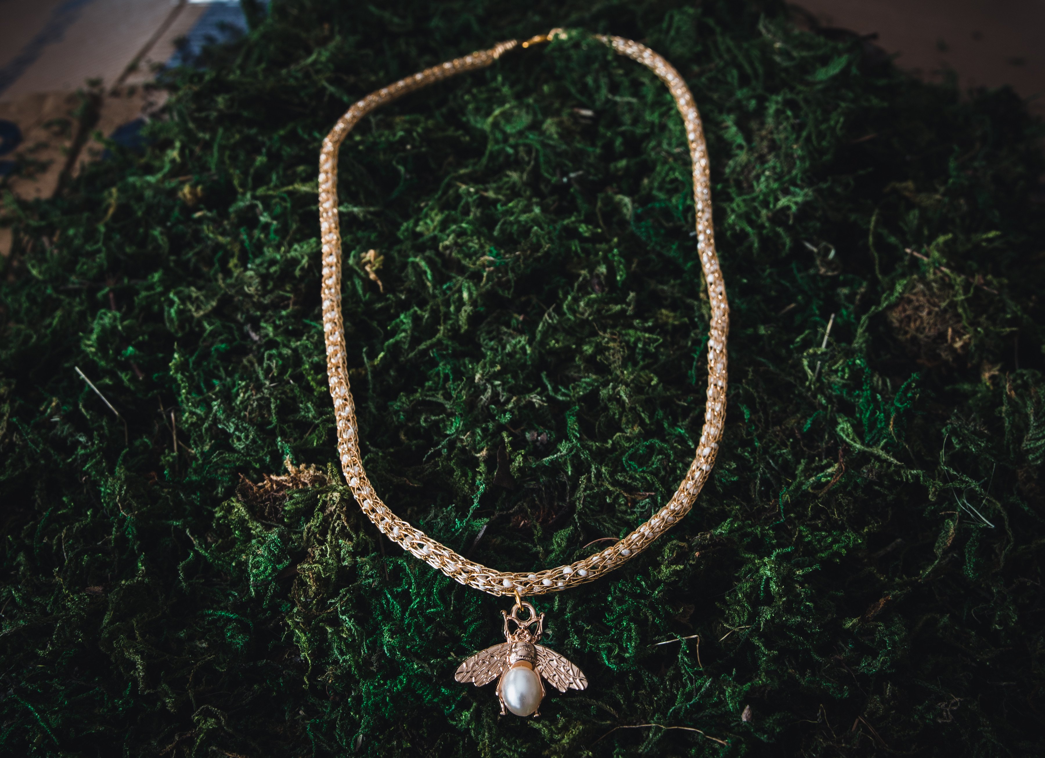 Faux Pearl Golden Bee Viking Knit Necklace