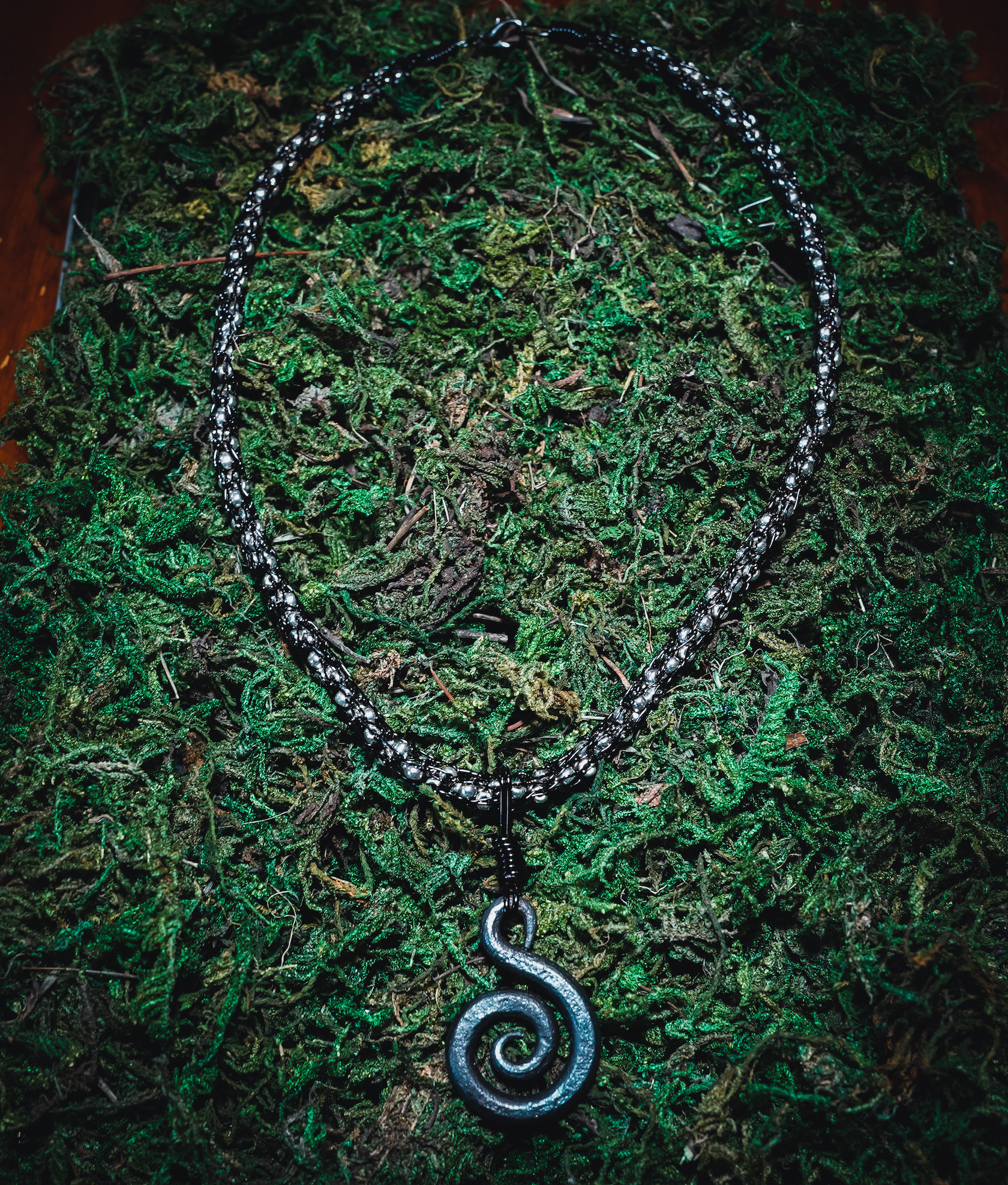 This necklace, made in collaboration with Misty (@Wildkhat) of Beehive Forge, was designed with a witchy inspiration in mind. The spiral pendant was hand forged by Misty and the beaded viking knit chain was hand beaded and knit by me. This necklace is one of a kind!