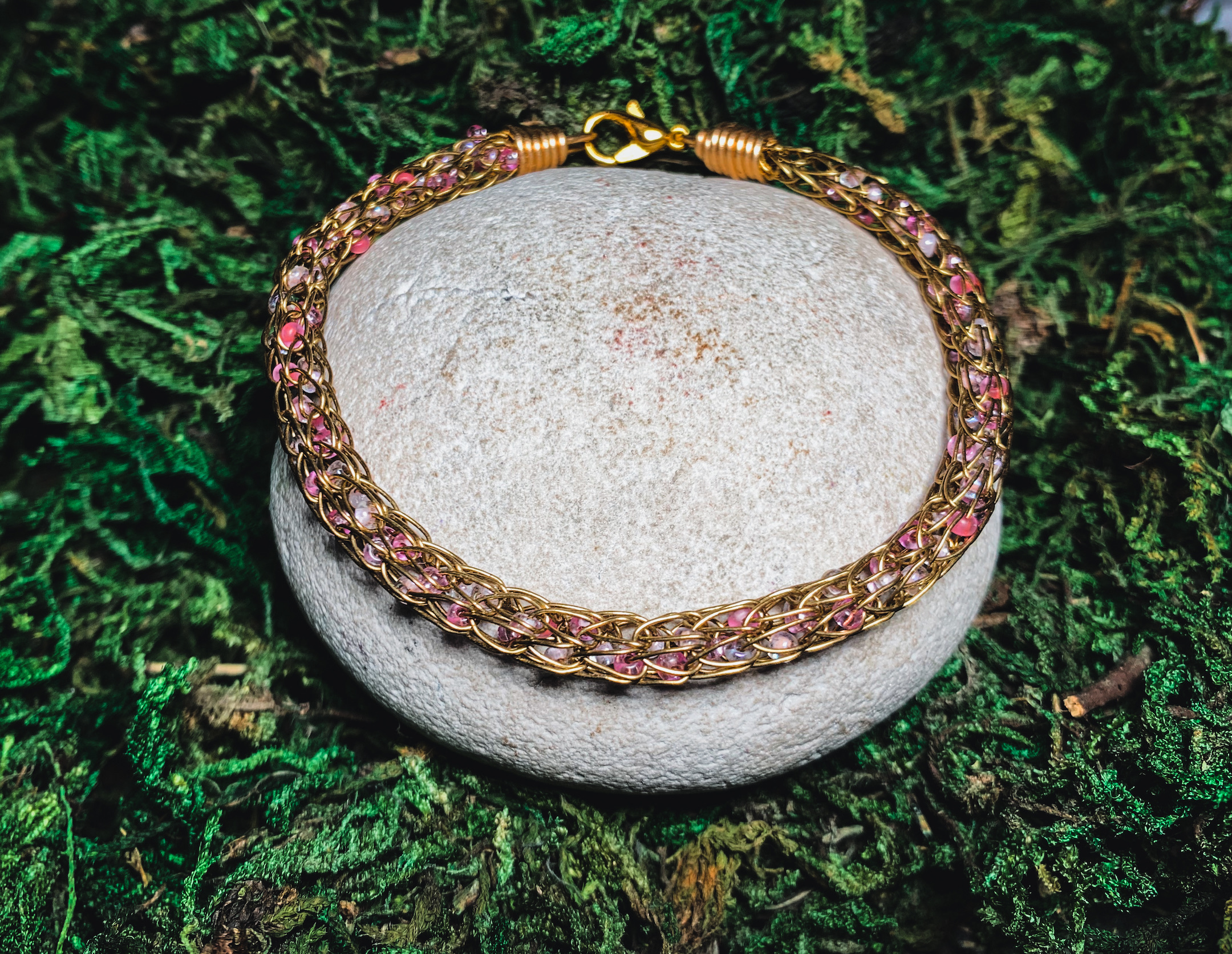 SAMPLE Pink Beaded Brass Viking Knit Bracelet