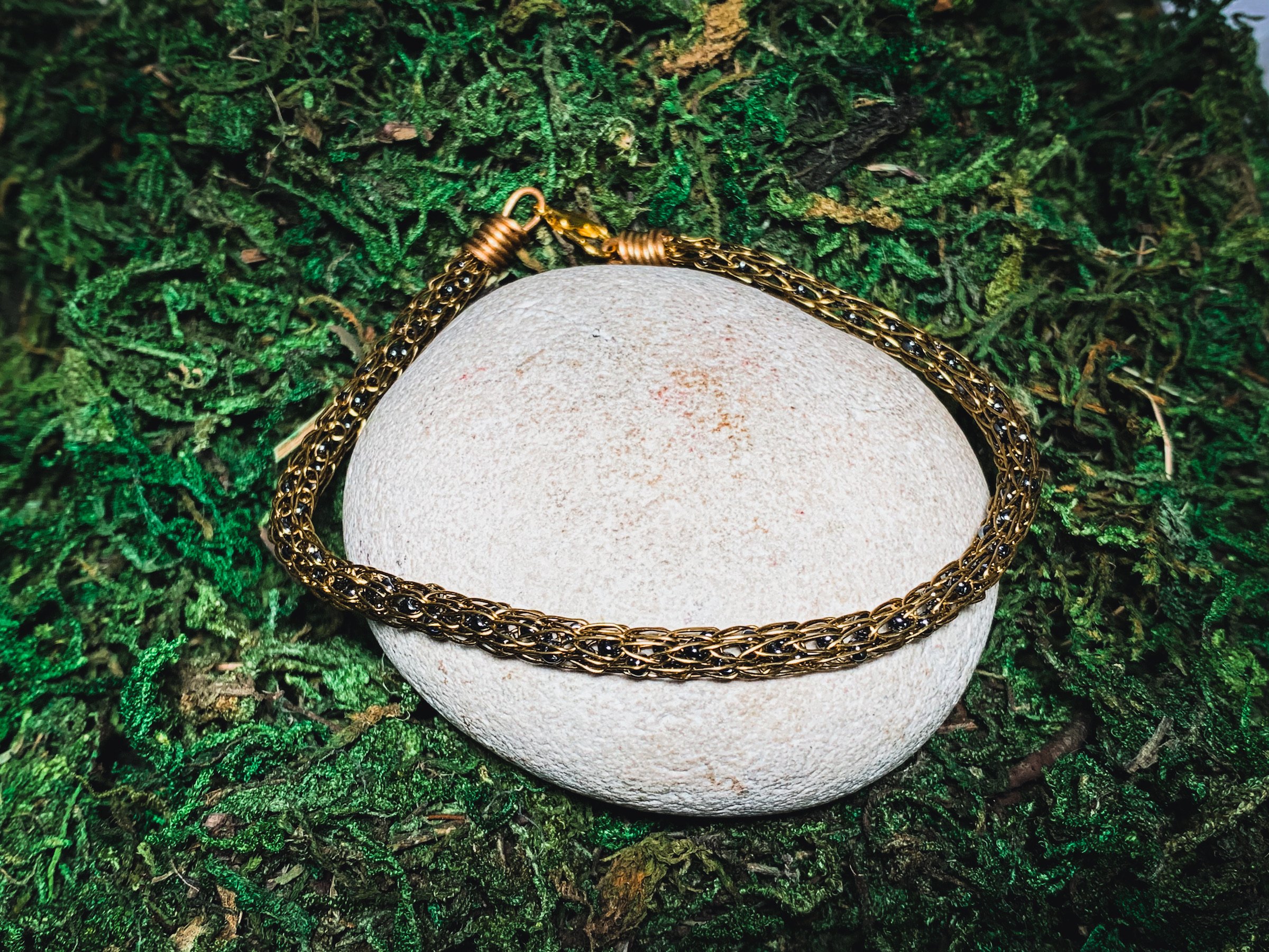 This experimental bracelet was one of only a couple brass bracelets hand knitted with hematite beads. There is only one skinny version in existence and will not be remade.