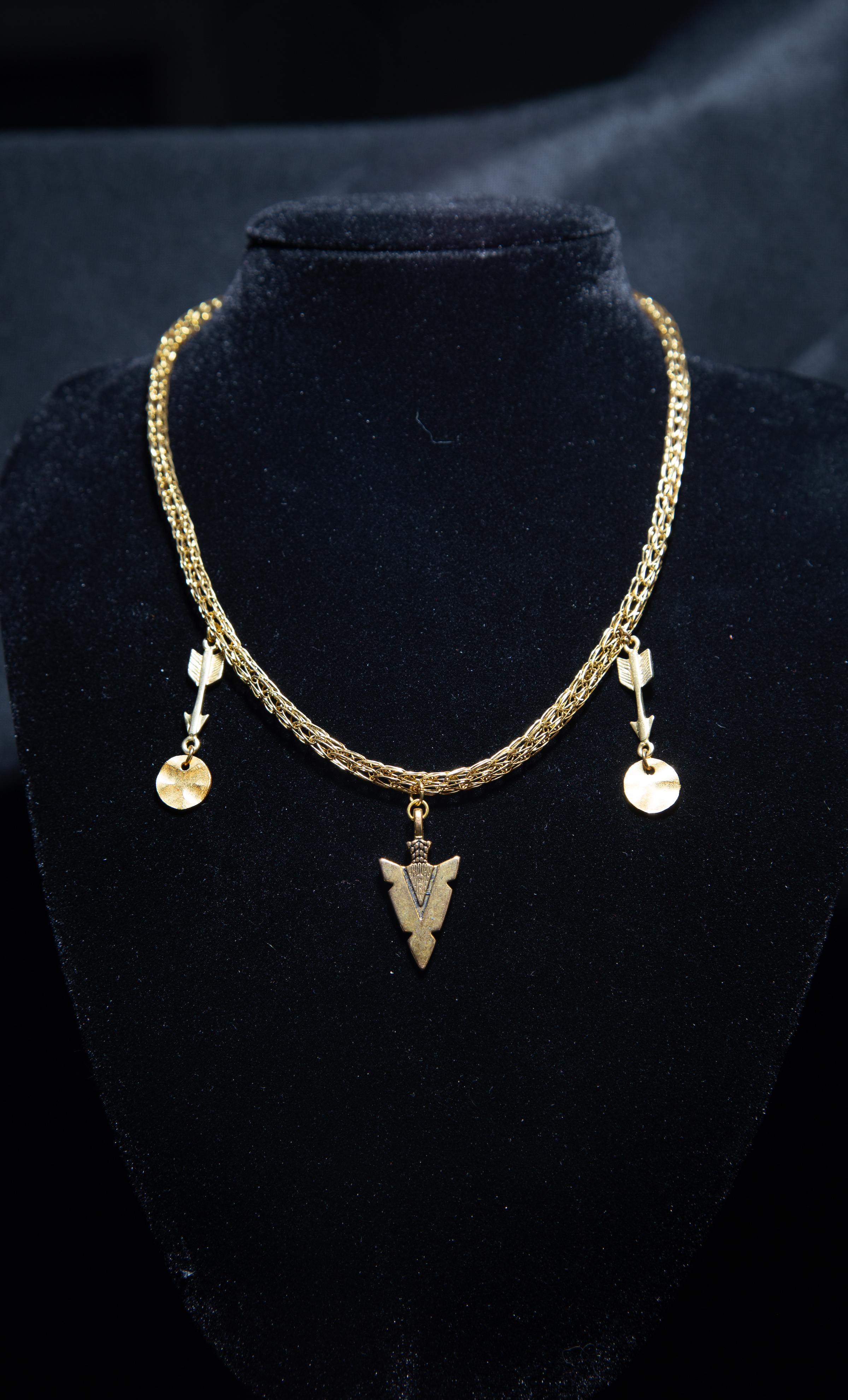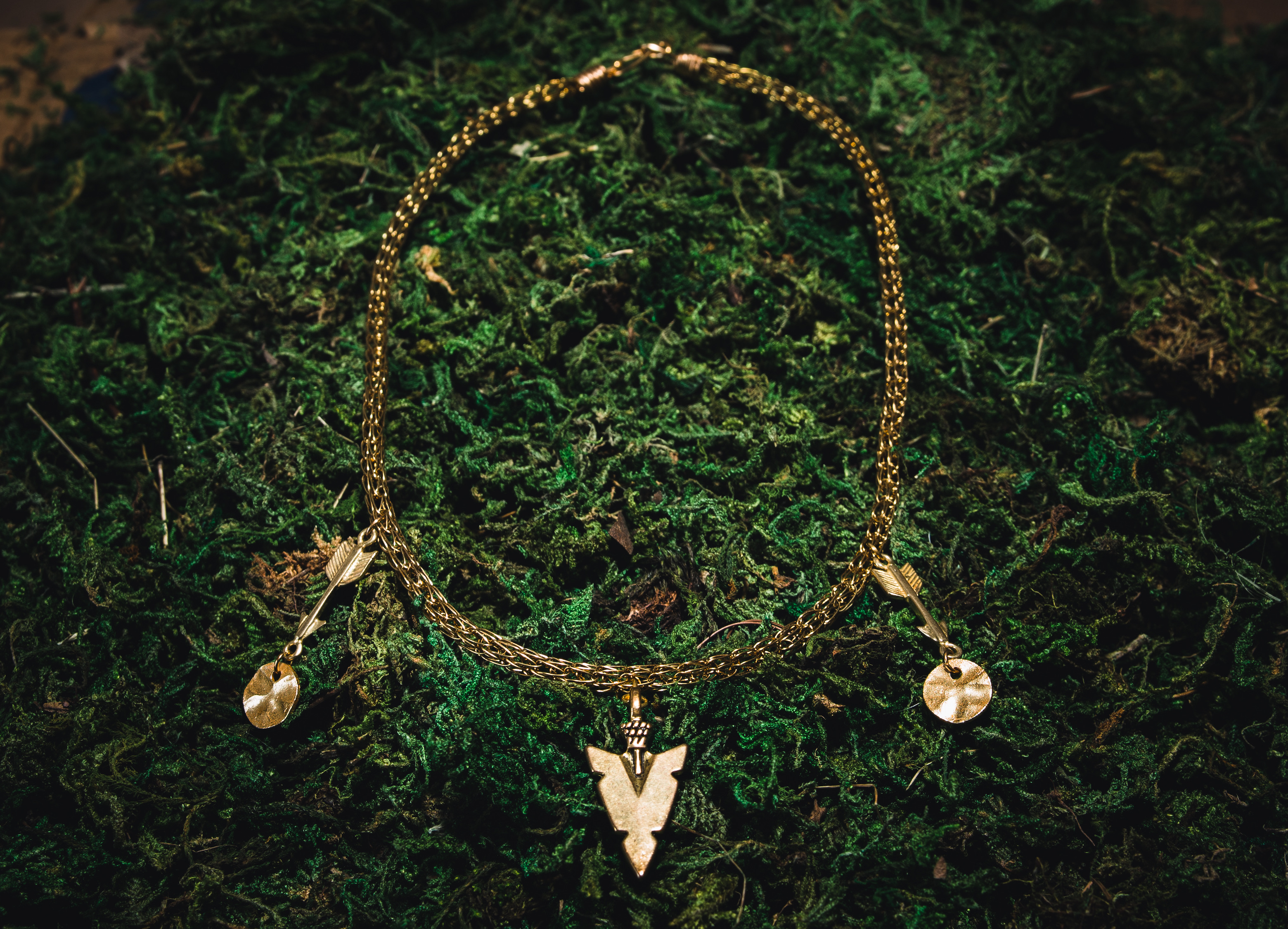 The golden arrows necklace, made lovingly through viking knitting. The handmade chain is approximately 17-18 inches (43.5-46 centimeters) including the s-hook clasp.