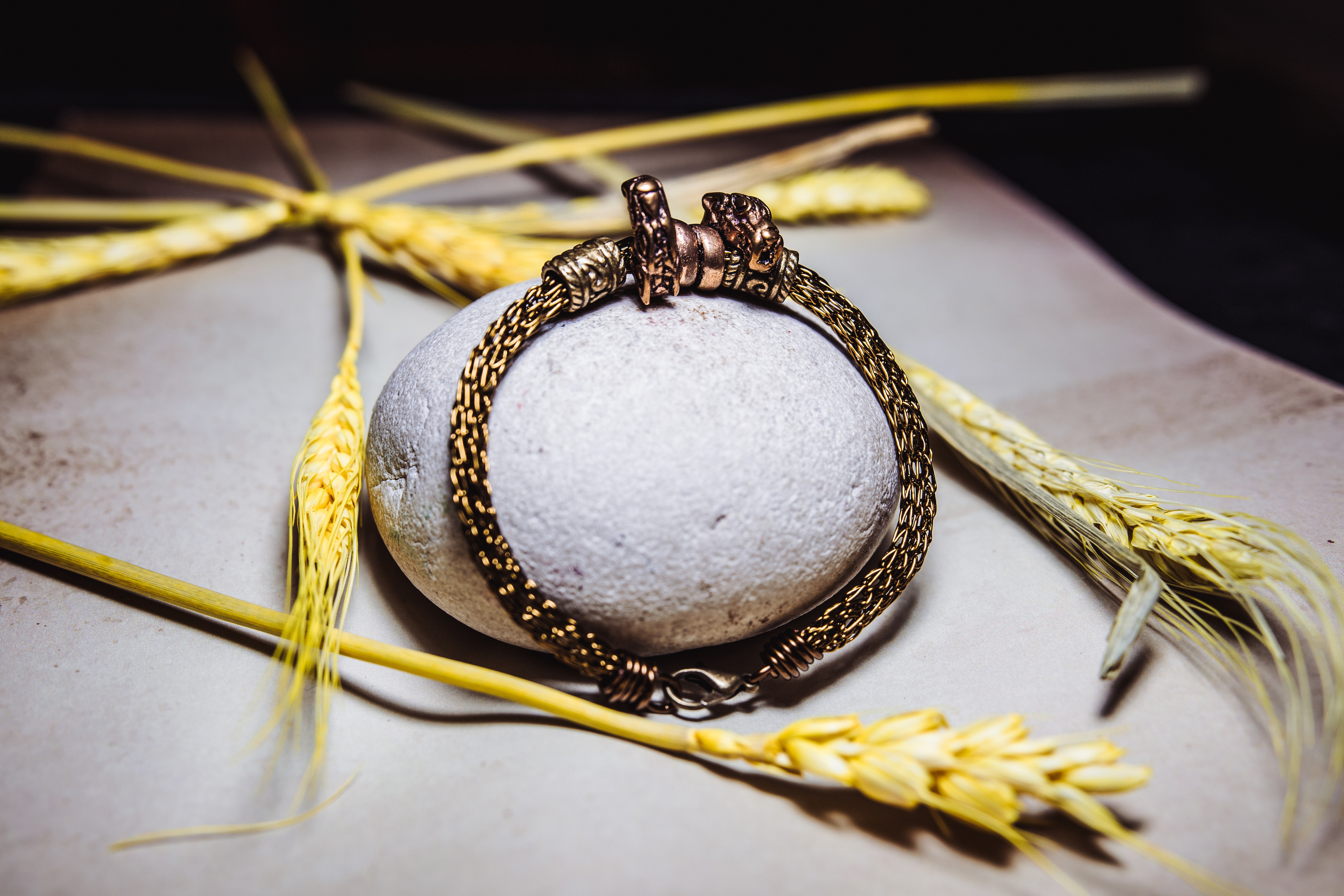 The dragon bead is made of bronze and the two spacer beads are made of alloy. The handmade viking knit chain is made of bronze-plated copper wire and the lobster claw clasp is made of bronze-plated alloy.
