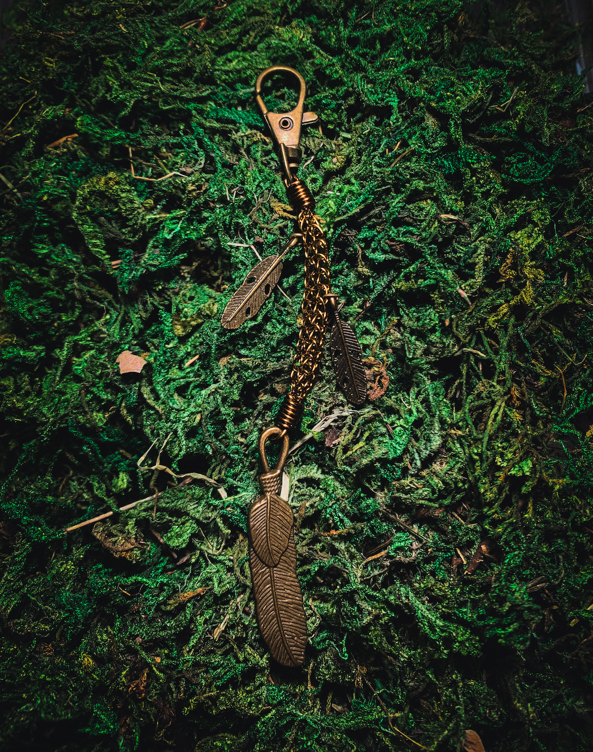 The keychain is 6 inches (15.2 centimeters) in length. The handmade viking knit chain is made of bronze-plated copper, the keyring clasp is bronze-plated alloy, and the feather charms are made of alloy.