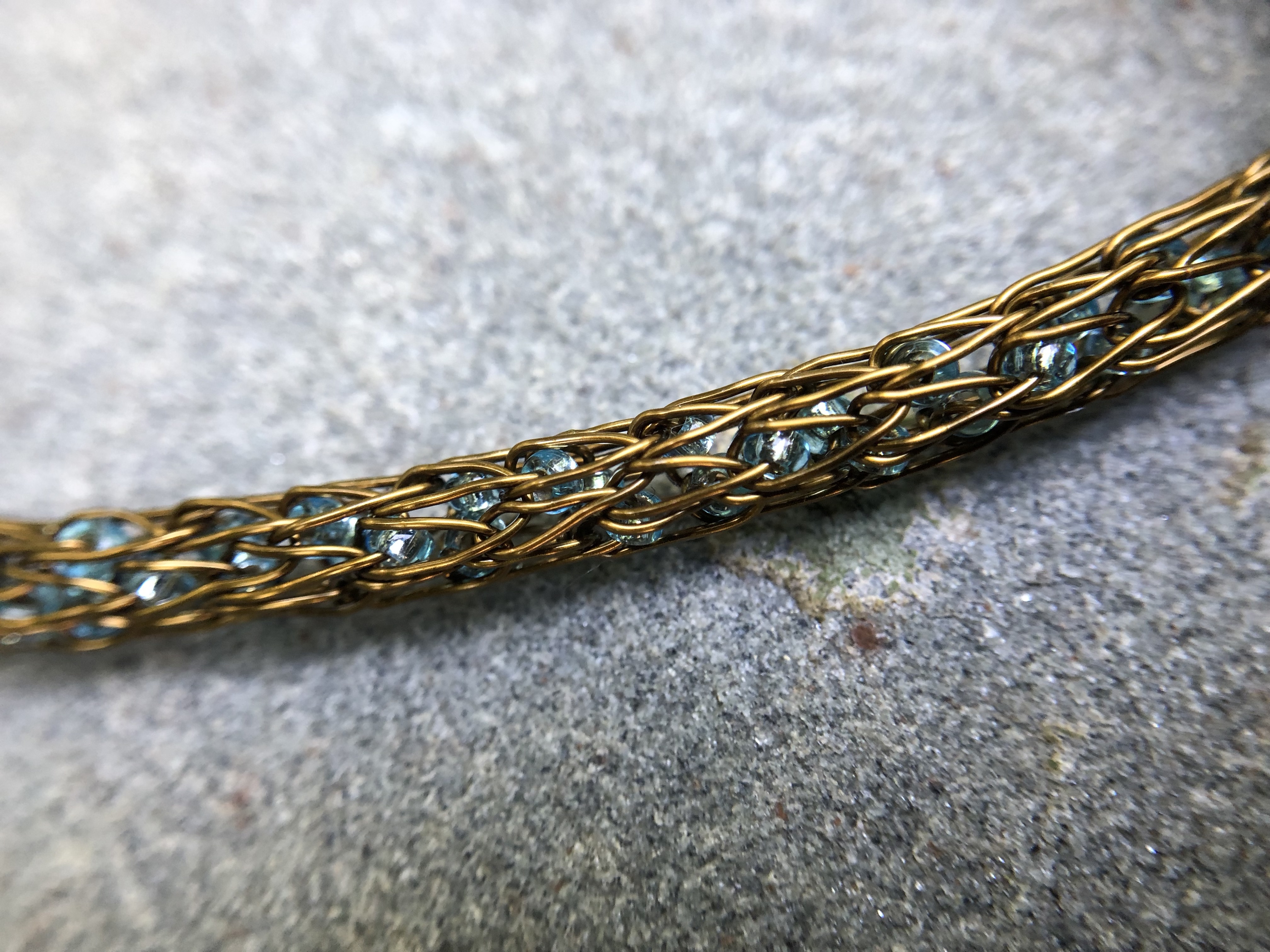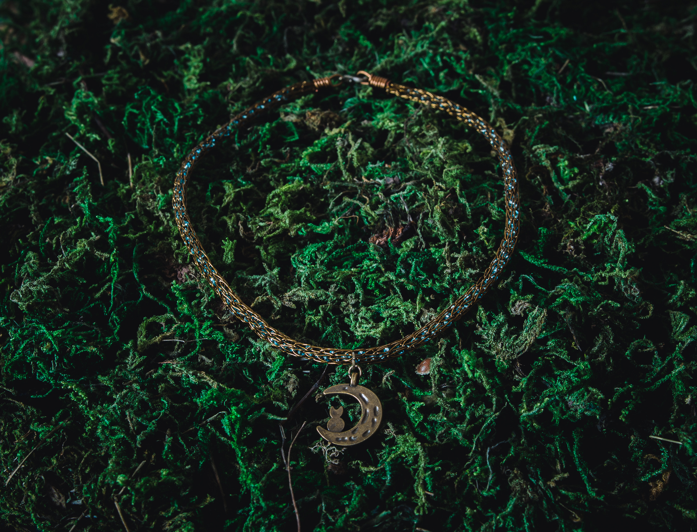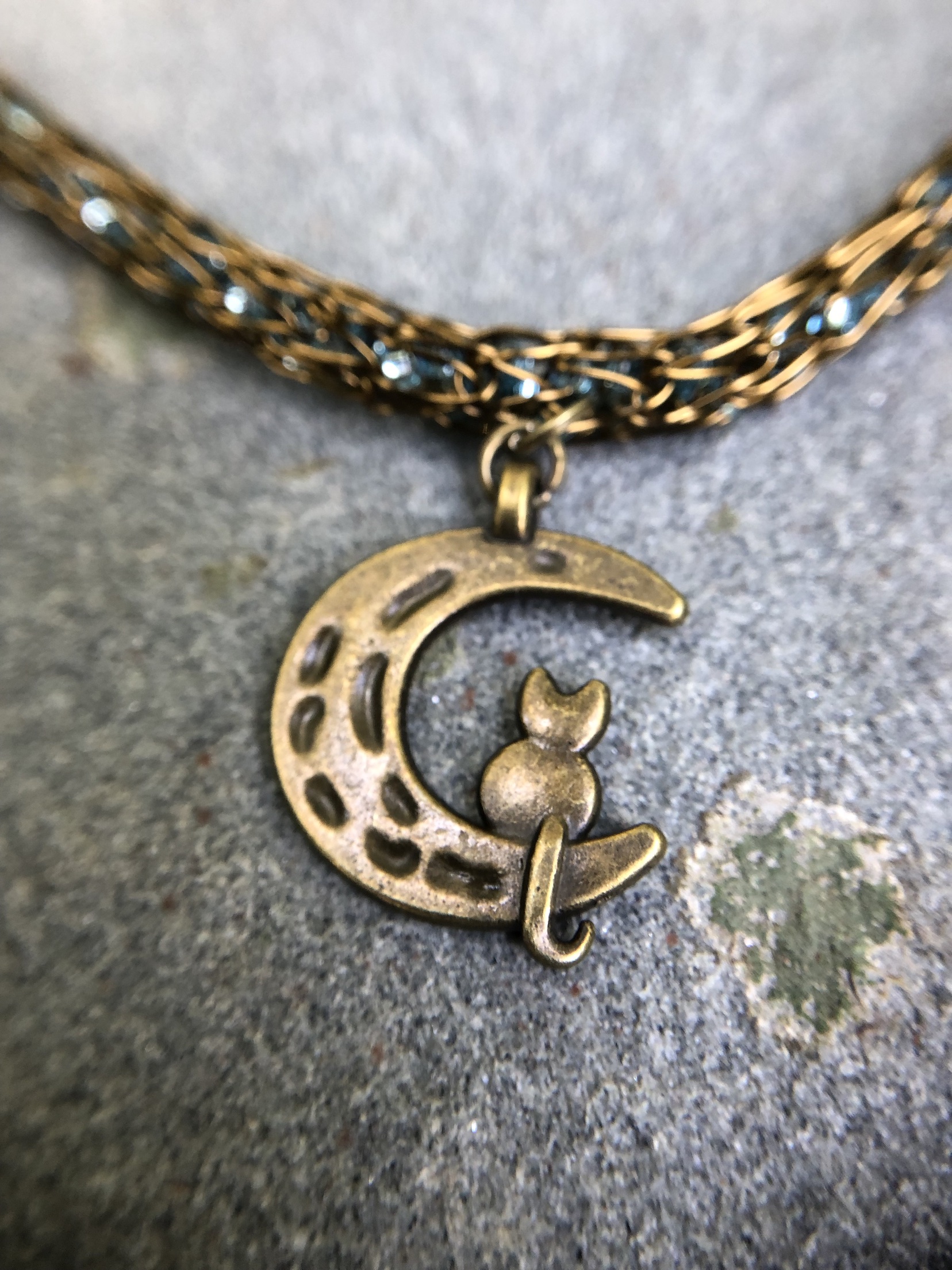 Bronze & Blue Cat on the Moon Beaded Viking Knit Necklace